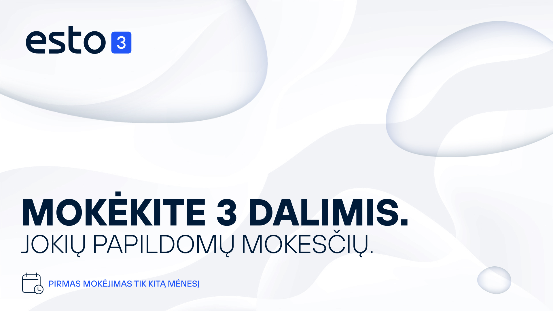 ESTO 3 yra populiariausias naujos kartos mokėjimo būdas. Patogiai padalinkite pirkinio sumą į 3 vienodus mokėjimus. Įsigykite būtent tai, ko reikia, be palūkanų, be papildomo mokesčio ir be įnašo. ESTO 3-jų dalių mokėjimo sprendimu pasinaudoti galite internetinėse ir fizinėse parduotuvėse. Visas ESTO partnerių parduotuves rasite ESTO Market: https://esto.eu/lt/esto-market?lang=lt.